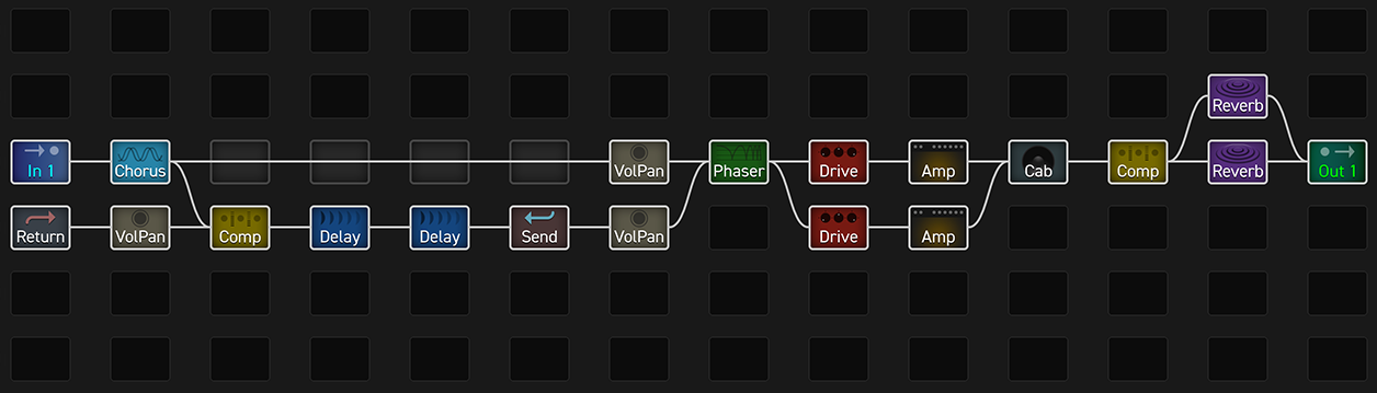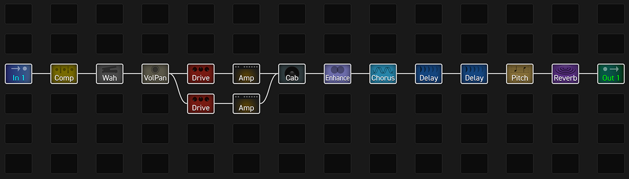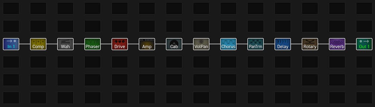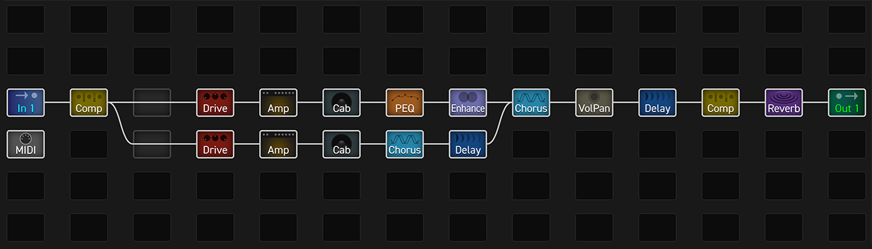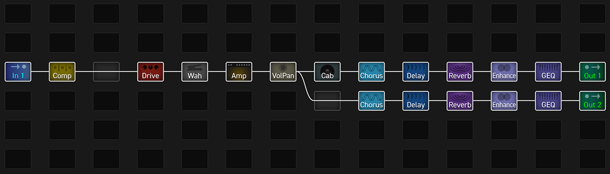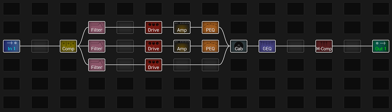 Computer playback is also easy and flexible. Computer outs 1 and 2 play back directly at the main outs of the FM9, where they are mixed with processed audio from your presets. USB outs 3 and 4 play back at the second output of the FM9. This makes it possible, for example, to have processed guitar at one stereo output and backing tracks at a second output. Computer outputs 5 and 6 address the “Input 1 block” of the FM9, providing an easy way to route DI signals to the unit for recording. The last pair of USB computer outputs work with a special “USB” grid block. This can also be used for re-amping or other creative effect processing in the DAW, like a virtual plugin.