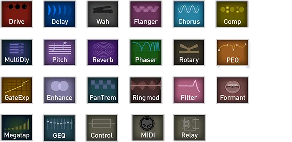 The FX8 offers a stunning array of stompbox and studio effects, all based on the effect algorithms made famous by our Axe-Fx II line of processors. Effects are placed as “blocks,” many of which can be configured as various effect “types”. For instance, the DRIVE block includes simulations of 34+ different fuzz, overdrive, distortion, and boost pedals. The DELAY block offers types for analog, digital, tape, and more.